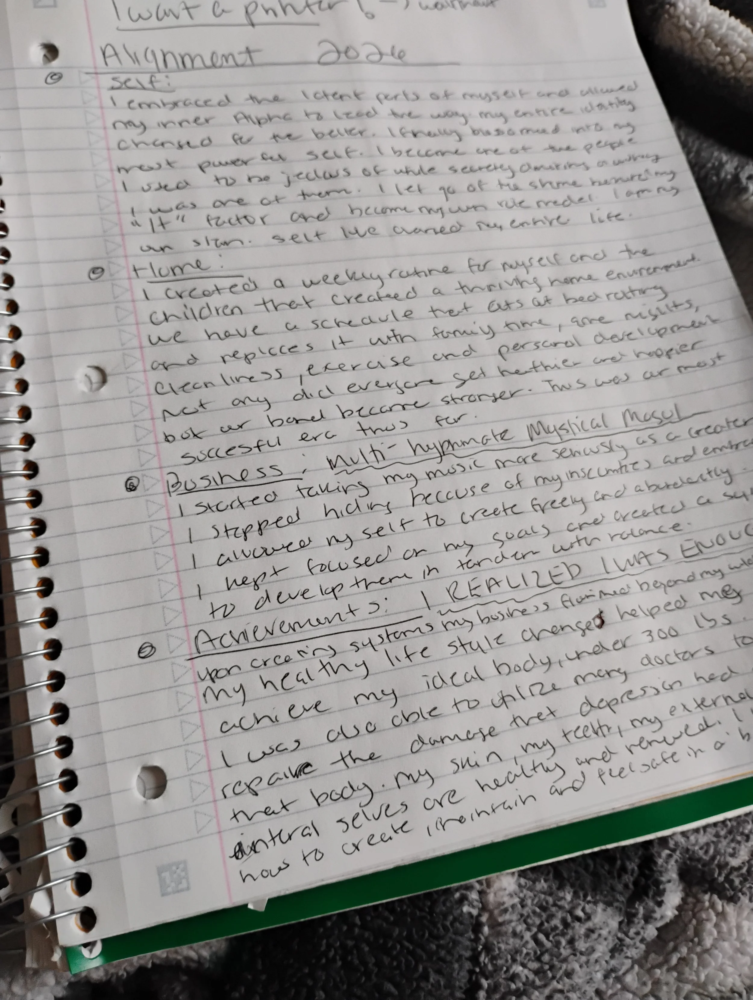 BEFORE: I wrote my intention for this script as it's title "Alignment 2026". I am aligning with my highest timeline, the energy of love. I picked three main areas to focus on shifting in order to achieve this goal- Self, Home and Business. Completing tasks in increments of three activates a starting sequence or portal opening. Look into Nikola Tesla's 3-6-9 method, if you'd like more information on this.